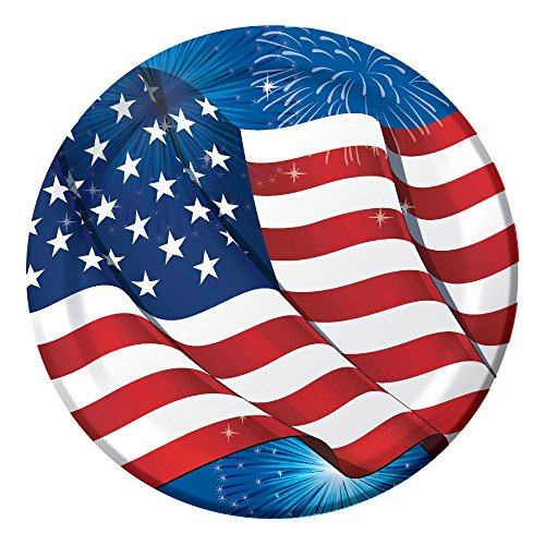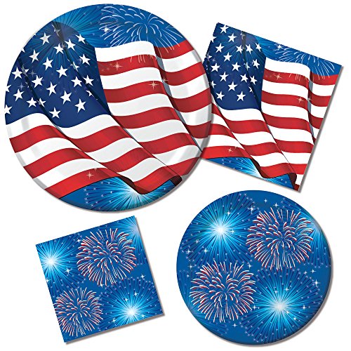 Patriotic Party Supplies, Tableware Pack for 8 Guests ~ 8 American Flag Dinner Plates, 8 Firewo...