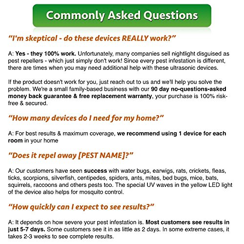 - Feature : WORKS EXTREMELY FAST & EASY - Each sonic pest fighter device emits electromagnetic & ultra sonic waves that simulate a fearsome predator being present in your house - naturally driving away rats, mice, rodents, spiders, ants, cockroaches, bugs & fleas away from your home without harming or killing them. The special UV waves for yellow LED light helps for mosquito control as well. / JUST PLUG IT IN AND IT STARTS REPELLING AWAY - Each device covers 1000 square feet (unobstructed area) so by getting 1 DEVICE FOR EACH ROOM, you'll experience the FASTEST results. / NO KILLING PESTS OR CLEANUP ANYMORE- because this puts a permanent end to setting rat traps, chasing rodents or using toxic poisons & sprays which can be harmful to you & your family. Why deal with the mess when you can just plug in this device into any outlet in every room of your house, and be set! No battery required! / 100% SAFE & PET-FRIENDLY- as it doesn't bother your pet dog or cat. Instead of spending thousands of dollars on (potentially harmful) pest control services, you can now avoid pest-infested diseases to you & your loved ones by using our EPA-certified product. Can be used indoor in home, apartment or even a warehouse. / 100 DAY MONEY BACK GUARANTEE - If your unit is defected, we'll replace it (free of charge). If it doesn't work for you, we'll refund your purchase on the spot - no questions asked. Even better - after 100 days of purchase, if you're not 100% thrilled with your purchase, just send the units back and we'll STILL give you your money back. We're a small family-owned business and your complete satisfaction is our #1 priority.