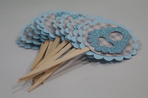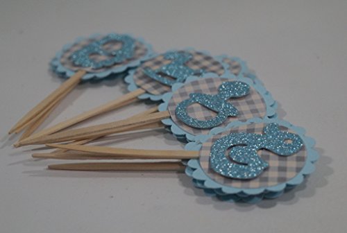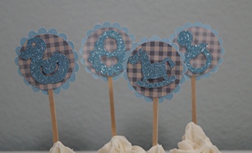 Studio : All About Details Publisher : All About Details Binding : Kitchen Product Description Pour cuteness in your incoming baby shower with these Blue Lagoon-Gray Plaid Baby Shower Cupcake Toppers. Made up of 3 layers cardstock. - Blue lagoon textured cardstock for the circular scallop frame - Gray plaid printed cardstock - Cut design in blue lagoon textured cardstock Each pack has 12 cupcake toppers designed with (4) rocking horse, (4) bib, (4) pacifier (4) rubber ducky. These baby shower elements are set in double adhesive tape. This setting gives a floating illusion to the decor. This cupcake topper has 2in diameter and 2.5in long food safe stick. The food safe stick gives you freedom on how tall you want the topper set in your cupcake. 0