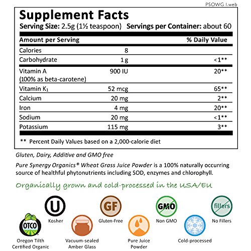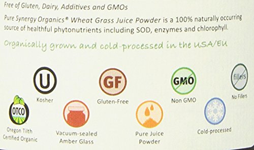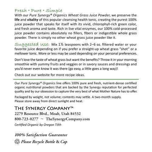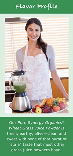 -. Binding : Health and Beauty -. Brand : The Synergy Company -. EAN : 0852971004224 -. Feature : Vibrant, fresh-tasting certified organic pure juice powder with tons of uses / Rich source of chlorophyll, a traditional blood cleanser and builder / Enzymatically bioactive to spark healthy metabolic function and boost vitality / Patented CO2 low temperature-drying, cold-pressed juicing and cold-milling for maximum nutrient retention / Certified Organic and Kosher, Gluten-Free, Chemical-Free, Non-GMO, No Fillers/Sweeteners -. Label : The Synergy Company -. Manufacturer : The Synergy Company -. MPN : 1SLWHEATGRASS -. NumberOfItems : 1 -. PackageQuantity : 1 -. PartNumber : 1SLWHEATGRASS -. ProductGroup : Health and Beauty -. ProductTypeName : HEALTH_PERSONAL_CARE -. Publisher : The Synergy Company -. Size : 5.3 -. Studio : The Synergy Company -. Title : Wheat Grass Juice Powder - Pure Synergy Organics -. UPC : 852971004224