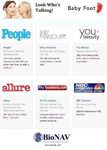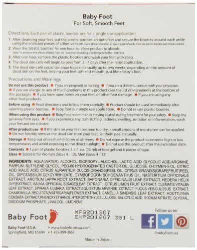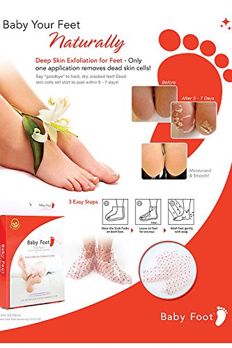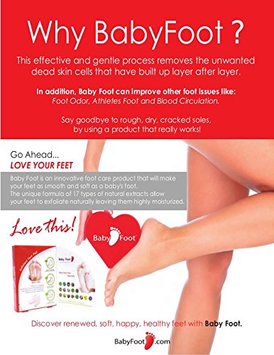 ReleaseDate : 2013-10-31 Studio : Baby Foot Publisher : Baby Foot Binding : Health and Beauty Product Description Baby Foot is an easy three-step process: apply, soak, then wash away. It takes only one week to remove the dead skin cells from the sole which means only one application to make your sole like a baby's. Results vary among individuals. In some cases it may take approximately two weeks. 0