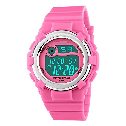 -. Feature : Round plastic pink 36 mm kids digital wristwatch / Japanese Quartz LCD display with Date, Alarm and Stopwatch / Glossy pink durable silicone strap / One Year Factory warranty / 30 M Water Resistant (no button pressing under water)