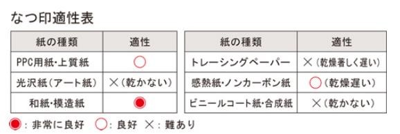 優れた耐水性・耐光性を発揮する水性顔料系インキを使用しています。にじみが少なく、なつ印した面に印刷された下文字が浮き出にくいので、登記簿、小切手や手形、証券類などの長期保存を必要とする重要書類のなつ印に最適です。また、ノンカーボン紙や感熱紙へのなつ印でも、発色文字を消したり、印影が変色することはありません。 |