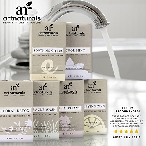 What's better than one luscious-lathering, aromatherapy soap bar? Why, six, of course art naturals' 6-piece soap bar set packages up six of the yummiest ways to wash your away your worries you've ever seen. This box of botanical oil-imbued jojoba oil bath bars takes custom cleansing to the next level with six varieties of soul-soothing essences. Pick the bar that suits your day and mood. Miracle wash sets off a revival of both body and mind with its anti-inflammatory tea tree oil. Mood-boosting cool mint wakes you up gently but powerfully with its invigorating eucalyptus extract-the perfect start to a busy day. Grapefruit extract-infused tropical cleanse exfoliates dead skin cells, revealing healthy, younger skin beneath and stimulating healthy cell renewal. Purifying zing with lemon essence produces a zesty, zippy, pore-purifying post-shower feel. Floral detox will calm your mind and relax your body, setting the stage for more restful, restorative slumber. Soothing citrus leaves your skin feeling blissfully beautiful with its bacteria-blasting orange essence. Centuries of use, and now therapeutic studies, have shown that essential oils can help you relax or sleep, or improve your skin or digestion-their benefits go well beyond a pleasant smell. They can have a healing effect mentally, physically, and emotionally. So whether you want to wake up to happy or deep clean before bed, art naturals' 6-piece soap bar set will transform shower or bath time into your own, personal skin-smoothing, soul-soothing spa experience oh-and we bet you know someone who'd love to have that experience, too. The soap bar set makes a super-sensory gift.Feature