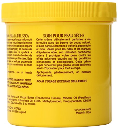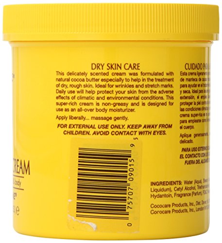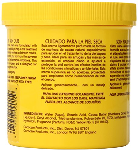 Cococare Cocoa Butter Cream. Description: The Yellow One. Super-Rich Formula for Hand and Body. Dry Skin Care. This delicately scented cream was formulated with natural cocoa butter especially to help in the treatment of dry, rough skin. Ideal for wrinkles and stretch marks. Daily use will help protect your skin from the adverse effects of climatic and environmental conditions. This super-rich cream is non-greasy and is designed for use as an all-over body moisturizer. Disclaimer: These statements have not been evaluated by the FDA. These products are not intended to diagnose, treat, cure, or prevent any disease.Feature