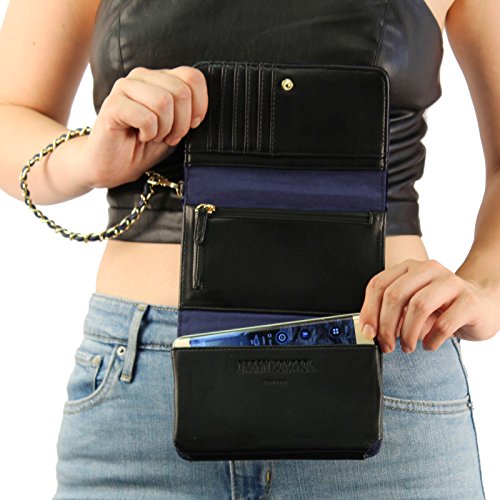 - Coin zipper compartment with rear receipt holder slot Chain wrist strap: 5-1/2" drop: removable strap to use a wallet in your handbag