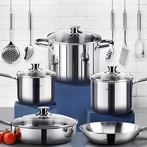 1. 4 pans 1 pot: 1.5 QT covered saucepan, 2.5 QT covered saucepan, 5 QT covered stockpot, 8" fry pan, 9.5" covered saute pan, designed to meet the needs of everyday cooking. 2. 5 cooking utensils: 1 Potato Masher, 1 Solid Spoon, 1 Pasta Fork, 1 Slotted Turner and 1 Skimmer. 3. Mirror polished cookware set blends well with your kitchen and dining room.