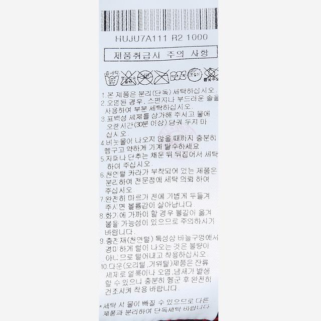 세탁방법 및 취급시 주의사항 1.본 제품은 분리(단독) 세탁하십시오. 2.오염된 경우 스펀지나 부드러운 솔을 사용하여 부분 세탁하십시오. 3.표백성 세제를 삼가해 주시고 물에 오랜시간(30분이상) 담궈 두지 마십시오.