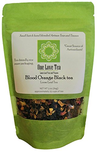 -. Feature : One Love Tea - Small batch hand blended Artisan Teas and Tisanes / 1 bag of 3 oz loose tea, makes approximately 25 cups of tea / Great Source of Antioxidants, Eco-friendly rice paper packaging / Organic Ingredients: Assam black tea, blood orange peel, dried apple, rosehips, safflower, blood orange extract. / Enjoy hot or cold. Contains Caffeine