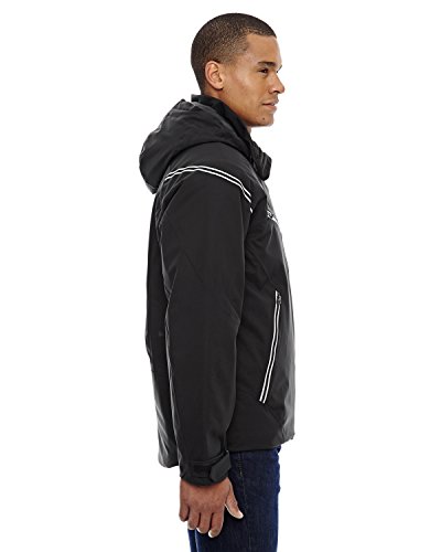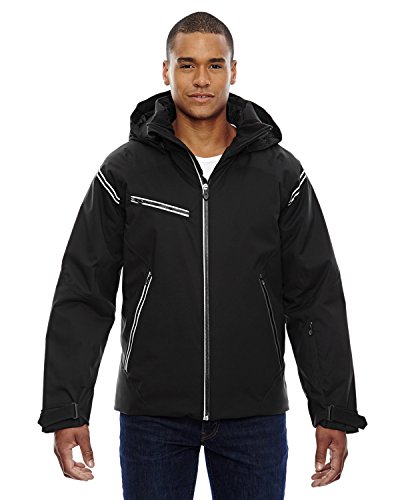 Binding : Apparel Product Description North End Sport Red Ventilate Men's Seam-Sealed Insulated Jacket, 10,000 mm waterproofness/5,000 g breathability, SHELL: 100% polyester mechanical stretch, 5.6 oz./yd2/190 gsm, LINING: 100% polyester taffeta, fully seam-sealed waterproof shell, tricot lined collar with laser perforation, front, chest and lower pockets with reverse coil zippers, zip-off thermal hood with rigid peak and multi-adjust system, inside storm placket with brushed tricot chin guard, adjustable shaped cuffs with tabs, stretch storm cuffs with thumb holes, sleeve pocket with detachable microfibre cloth to clean eye wear, thermal retention shockcord at hood and drop back hem, zip-off snowskirt with gripper elastic, mesh underarm vent with zipper, stowable neck warmer system with EZAWAY® feature. 0