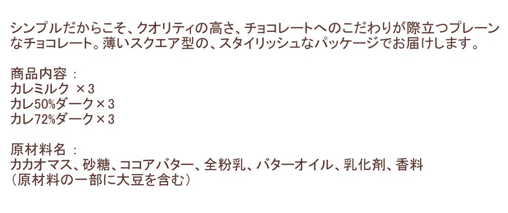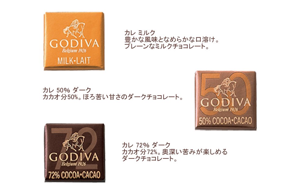 【注:ショッピングバッグの有無】:「ゴディバジャパンが発送」を選択された場合のみ同梱されます。カレ9枚(3種 ミルク/50%ダーク/72%ダーク)ギフトコレクション サイズ:縦134X横134X高さ12.3mm 約80g保管方法:涼しい場所(15℃~18℃が適温です)で保存してください。賞味期限:1か月以上のものをお送りしております。ご注文後のキャンセル・変更はお受けできませんので、ご了承ください。