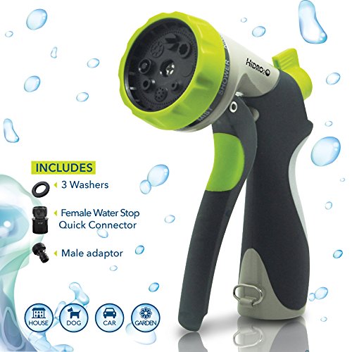 -. Title : Garden Hose Nozzle By Hidro2O, Heavy Duty Hand Metal Sprayer, 8 Adjustable Pattern,High Pressure, p.i.s.t.o.l Grip Front Ergonomic Trigger - Flow Control Knob, Ideal Watering Garden,Plants, Cleaning, Washing Cars, Dogs & Pets, FREE 3 Washers and Connectors.