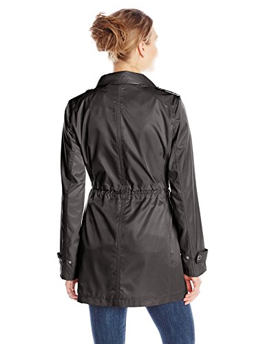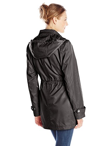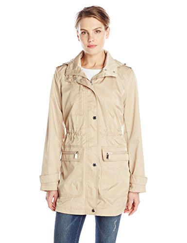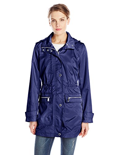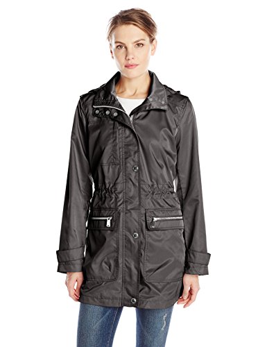 Hooded anorak with zip-and-snap placket featuring internal drawcord and zippered-flap pockets