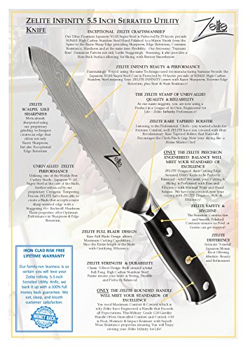 100% SATISFACTION or MONEY BACK GUARANTEE - TRY IT RISK FREE >>> Lifetime Warranty against Manufacturing Defects (only if purchased direct from 'Zelite Infinity' - check item is "sold by Zelite Infinity"). Our Utility Knifes have been built with Perfection in Mind. Ideal Gift (Christmas, Weddings, Birthdays, Fathers Day, Mothers Day), for Home Cooks, Professional Chefs, Culinary Students and more. You can't lose. Limited Supply, Order Now before they are Sold Out!