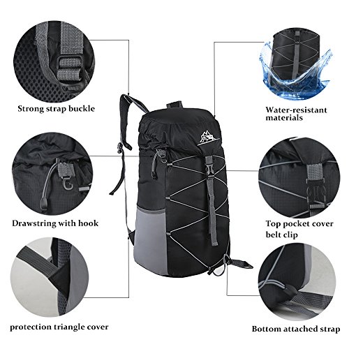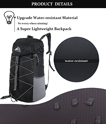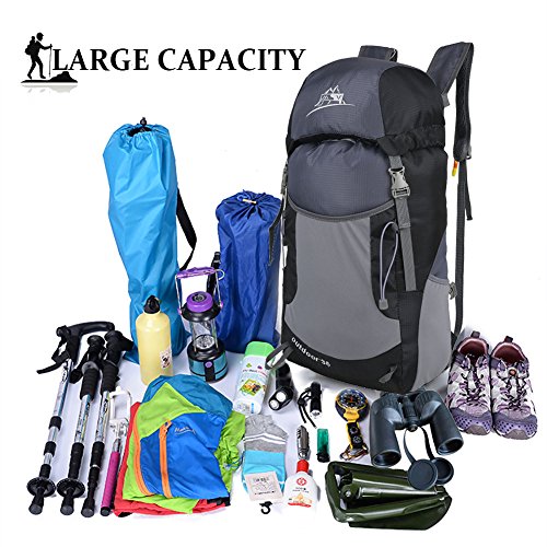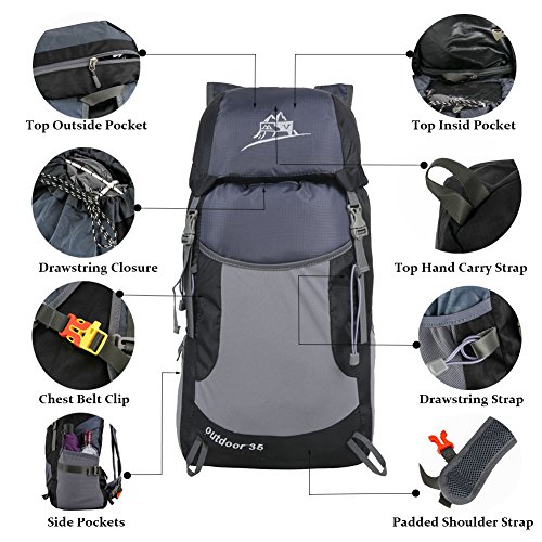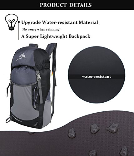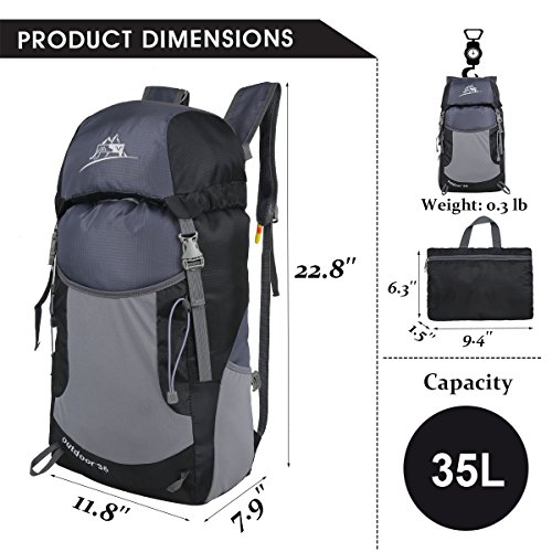 -. Brand : Peicees -. Feature : HIGH CAPACITY - 1 drawstring closure main compartment and 1 divided inside pouch for your laptop/ipad and clothing. 2 side pockets for water bottle or umbrella. 2 top zippered pocket for secret storage and protection. 1 outside pocket for easy access to your items. It's roomy enough for your hammock, clothes towel, journal and a couple beers if needed, etc. / COMFY ADJUSTABLE STRAPS - Thick, wide, adjustable and comfortable shoulder straps with padding can relieve weight for your shoulder when carrying backpack for a long time. / DURABLE BUCKLES - Multiple attachment and straps for hanging tools, trekking pole, tents, sleeping bags, and other items. / LIGHTWEIGHT TRAVEL PARTNER - Our packable backpack can be folded to an ultra-compact pouch. Easily pack it in your suitcase for extra use and avoid overweight charges, simply unfold from your lage and use it as a lightweight travel backpack when arriving at your destination. / INTENDED USES - Perfect for hiking, camping, occasional travel, climbing, backpacking, mountaineering, international travel, daily/day-to-day use, beach. Use it as a school bag, sports backpack, beach bag, suitcase alternative, etc. -. ProductGroup : Sports -. ProductTypeName : OUTDOOR_RECREATION_PRODUCT -. Title : Peicees 35L Travel Backpack Lightweight Foldable Hiking Backpack Packable Camping Backpack Hiking Daypack for Women, Men