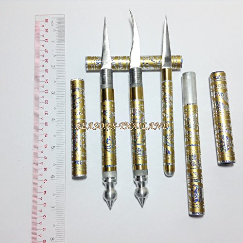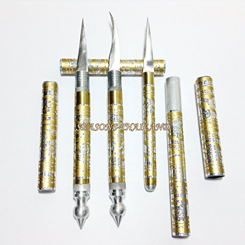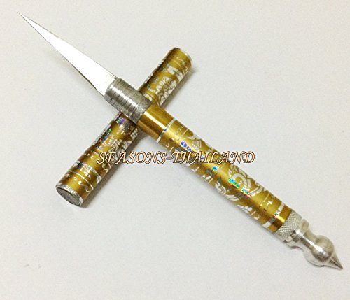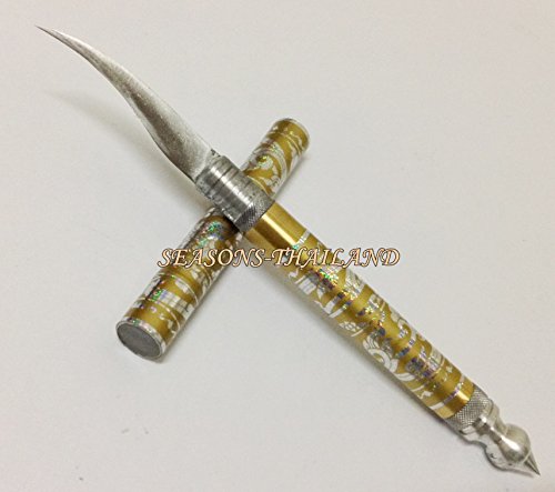 Set of Fruit Carving Knife Product of Thailand. Blade And Scabbard Beautiful Patterns Handle Carving Brass. Perfect for making delicate rose petals. Must take a good care of the blade as it can bend easily. This is the classical bird's beak knife commonly used in Thai carving classes and books. The stubby blade makes this is a must have tool for creating intricate Thai fruit and vegetable carvings.