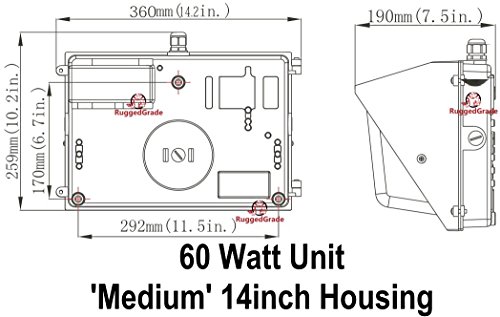 EASY INSTALLATON & OPTIONAL PHOTOCELL(not included). Unit has 3 conduit entrance locations and a standard circle cutoff in the rear for easy installation. Whether you are retrofitting an old unit or doing new construction, these are easy to use. Dusk to Dawn sensors (Photocells) can be added but are not required. 60 watt are 14 inch housing. 360mm x 259mm x190mm. Housing is black (some pictures may make it appear lighter)