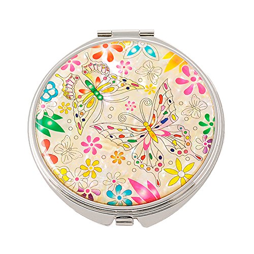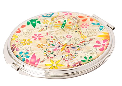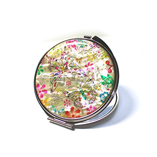 Mother of Pearl Butterfly and Flower Design Double Magnifying Compact Cosmetic Makeup Hand Mirror,Made in Korea