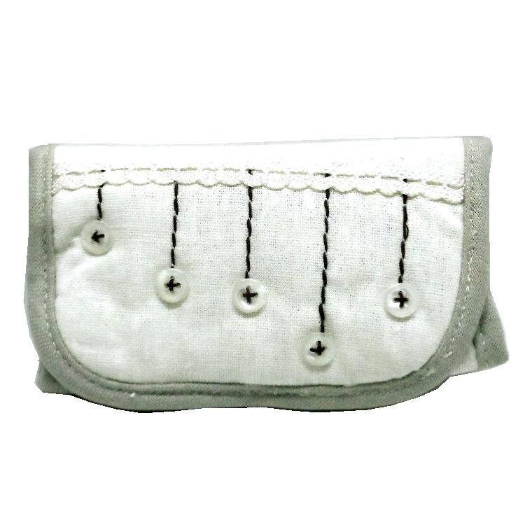 ネックレスや指輪、ピアスなどを入れるアクセサリーケースです。職場や学校、旅先などでアクセサリーを外さなければならないときに便利です。手のひらサイズで鞄やポケットにしまえます。ふわふわの布製でアクセサリーをいためません。お洒落なボタンが刺繍されたアクセサリーケースです。