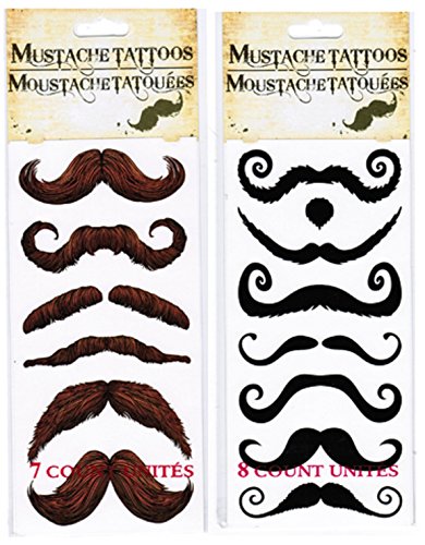 Product Description Mustache Tattoos! Easy to apply! Easy to remove! Makes the perfect gag gift! A great party favor or addition to a Halloween costume. 15 or 14 count in each package. 0