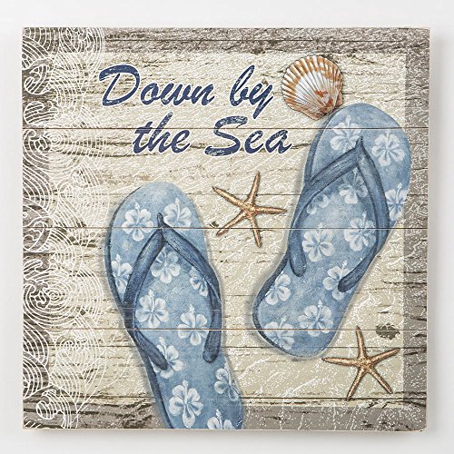 Flip Flop Sandals Down by the Sea Beach Themed Décor Sign Wall Hanging Plaque for Home - Wood - Star fish and Sandal