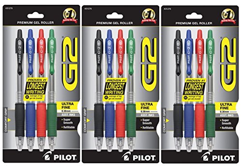 Pilot G2 Retractable Premium Gel Ink Roller Ball Pens, Ultra Fine Point, 4-Pack, Assorted Colors, Black/Blue/Red/Green Inks, 3 of Each Color = Total 12 Pens
