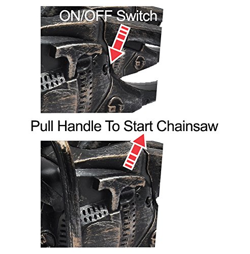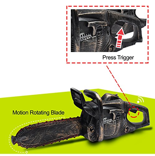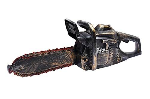Electric motorized chainsaw with a rusty-looking bloody blade with rotating chain. Make Halloween a lot more fun with props and decorations like this Chainsaw with Rusty Finish Prop Pull the handle up to initiate the chainsaw and press the trigger to rotate the blade. Requires 3 AA batteries (included). Perfect haunted house prop or Halloween costume accessory. Made of Plastic. 16 inches long x 6 inches tall x 4 inches wide. Sized for Children.Feature