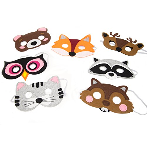 Includes 7 stitched felt masks. Animal masks include a raccoon, a cat, a fox, an owl, a bear, a chipmunk and a deer.