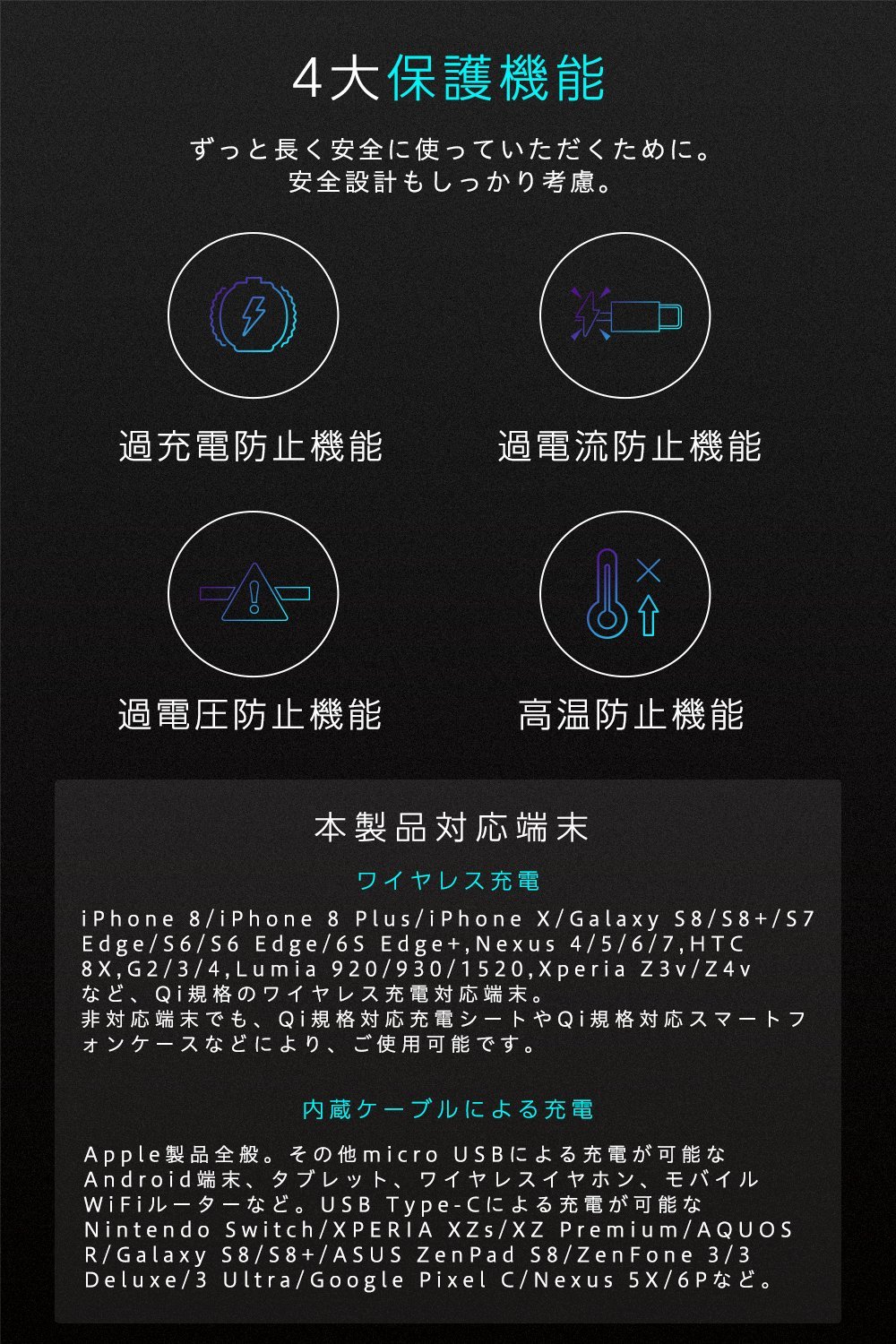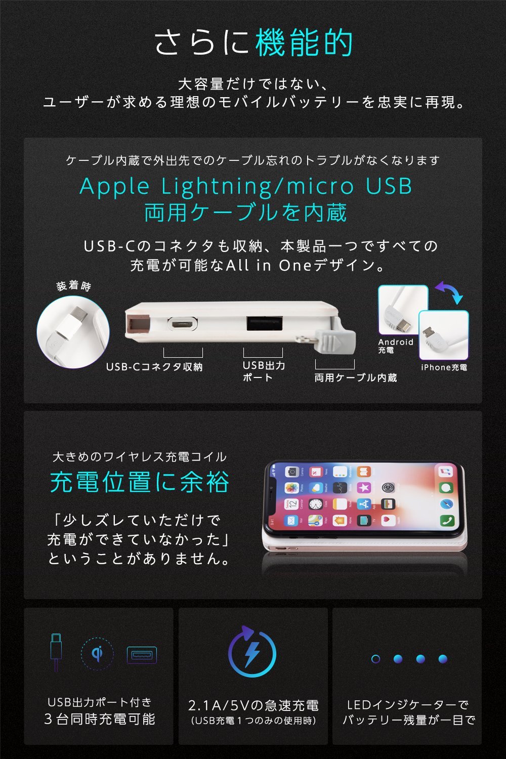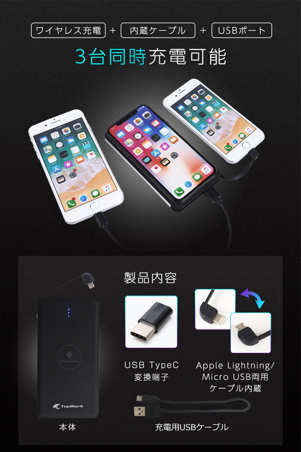 With built-in cable, you can charge any device such as Apple products such as iPhone / iPad, Android compatible with Micro USB, Pocket WiFi router, Wireless earphone.