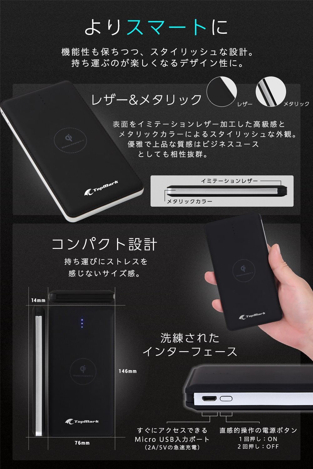 Very compact (148 x 76 x 14 mm) body, realizing a large capacity of 10000 mAh at the same time!