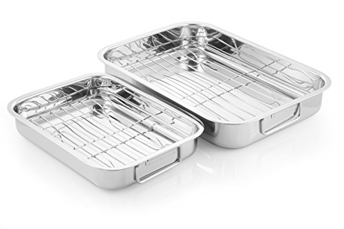 Studio : McSunley Publisher : McSunley Binding : Kitchen Product Description With this 2-piece stainless steel roasting set, the family chef will have every size needed to serve the perfect meal. With multiple sizes, they are great for lasagna, beef and pork roast or a one pan chicken meal. Designed with a high polish this provides a beautiful pan that can go directly from oven to table. To ensure the lasting beauty we recommend hand washing, please do not put into a dishwasher. Roaster dimensions are 12in x 9in x 2in tall and 15.75in x 11.25in x 2.4in tall. This roasting set is constructed of high quality stainless steel for durability and covered by a 10-year warranty with consumer satisfaction guaranteed!. 0