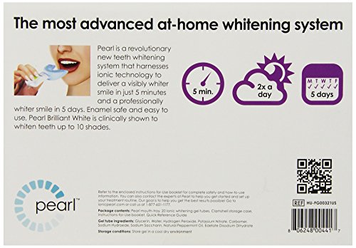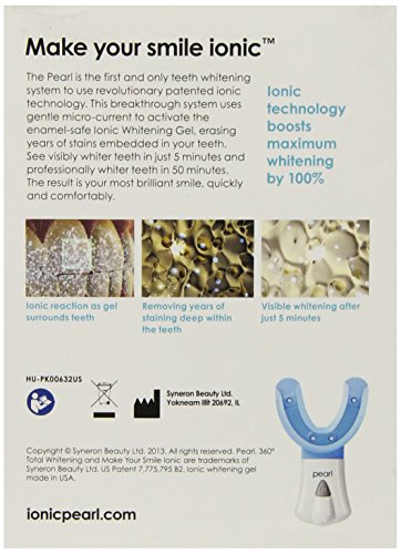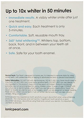 Ionic Pearl is a new revolutionary teeth whitening system that uses patented ionic technology to deliver visibly whiter teeth in just 5 minutes and professionally whiter teeth in 5 days. Enamel-safe and easy to use, the Pearl provides total-mouth whitening with no sensitivity or irritation. Easy to use, hands-free mouth-tray device is soft and comfortable. Device lasts up to 50 treatments, with additional booster kits of gel available for a smile boost or regular smile maintenance. Leaves your mouth feeling fresh, cool and clean.Feature