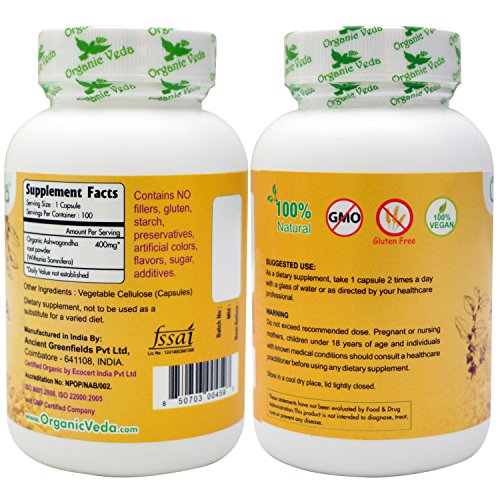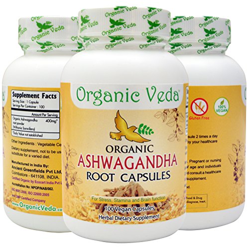 - Title : Organic Ashwagandha Root Powder 100 Veg Capsules. 100% Pure and Natural Raw Herb Super Food Supplement. Non GMO, Gluten FREE. US FDA Registered Facility. Kosher Certified Vegetarian Capsule. All Natural!