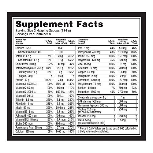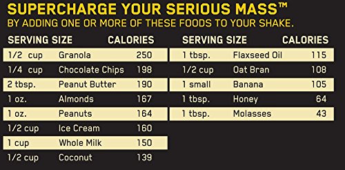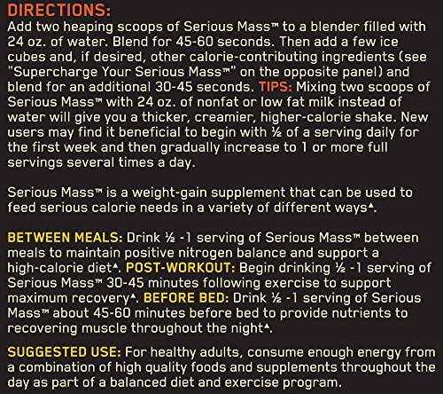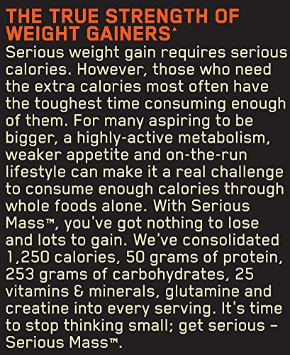 Serious Mass is the ultimate in weight gain formulas. With 1,250 calories per serving and 50 grams of protein for muscle recovery support, this instantized powder makes the ideal post-workout and between meals shake for sizing up your goals. Serious Mass provides you with the tools you need to pack on the pounds and help you develop the physique you’ve always wanted.Feature