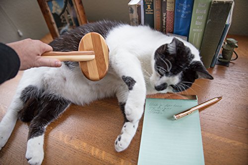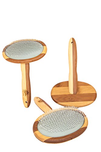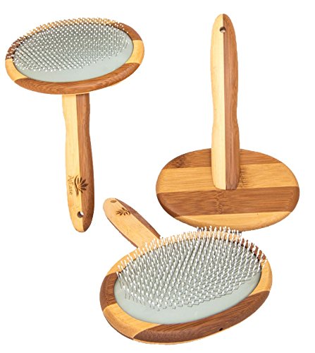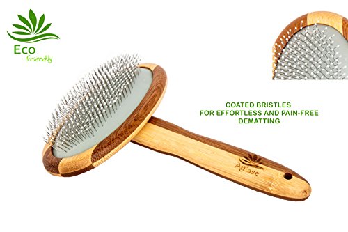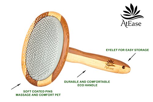 Choose a Stylish Eco Friendly Professional Pet Grooming Tool for your furry friend! This durable soft wire coated pin slicker brush boasts sustainability for the environment while pampering your pet. The Natural Bamboo handle fights static and the soft coated slicker pins stimulate blood flow and brings out the natural oils to create a shiny coat. AtEase Natural Pet Brush is a fabulous choice for eco conscience consumers, and is perfect for all size puppies, dogs, kittens and cats. Professionally designed for all stages of your pet's growth and suits all breeds with fine short medium and long hair. Saving you time money and stress by Dematting, Deshedding, and keeping unwanted hairs and allergies out of your home.This compressed Bamboo, best dog and cat brush, boasts an extremely hardness rating and fights dents from pet claws and continued use.Feature