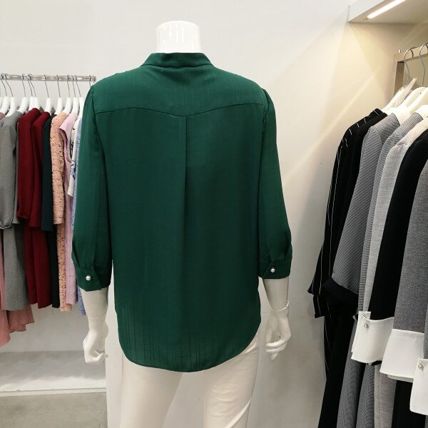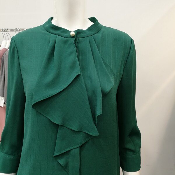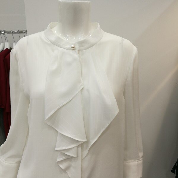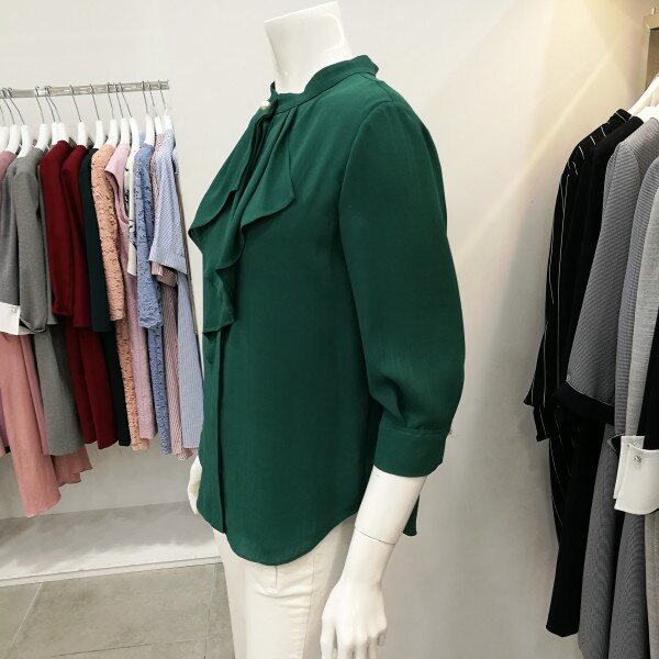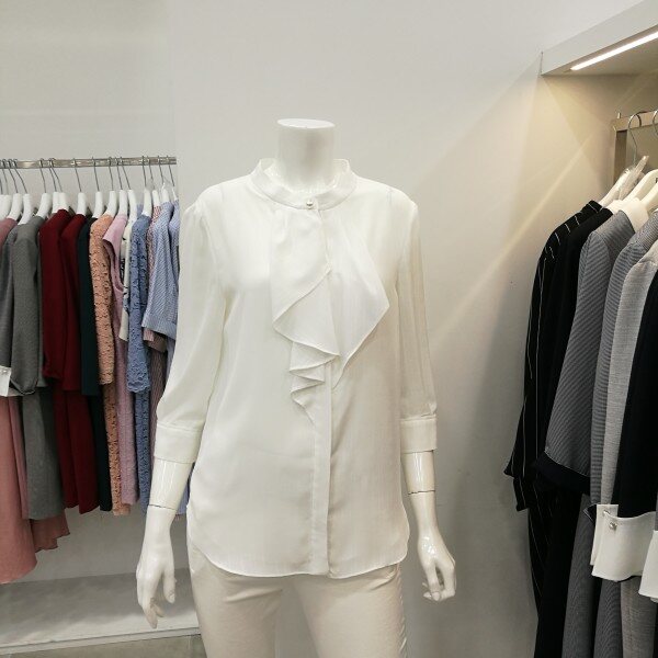 간절기 블라우스로 칠부소매이며앞에 프릴로 처리되있어 여성스러움을 강조하였고 진주장식으로 고급스러움을 표현했다.