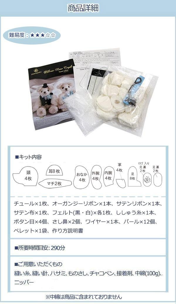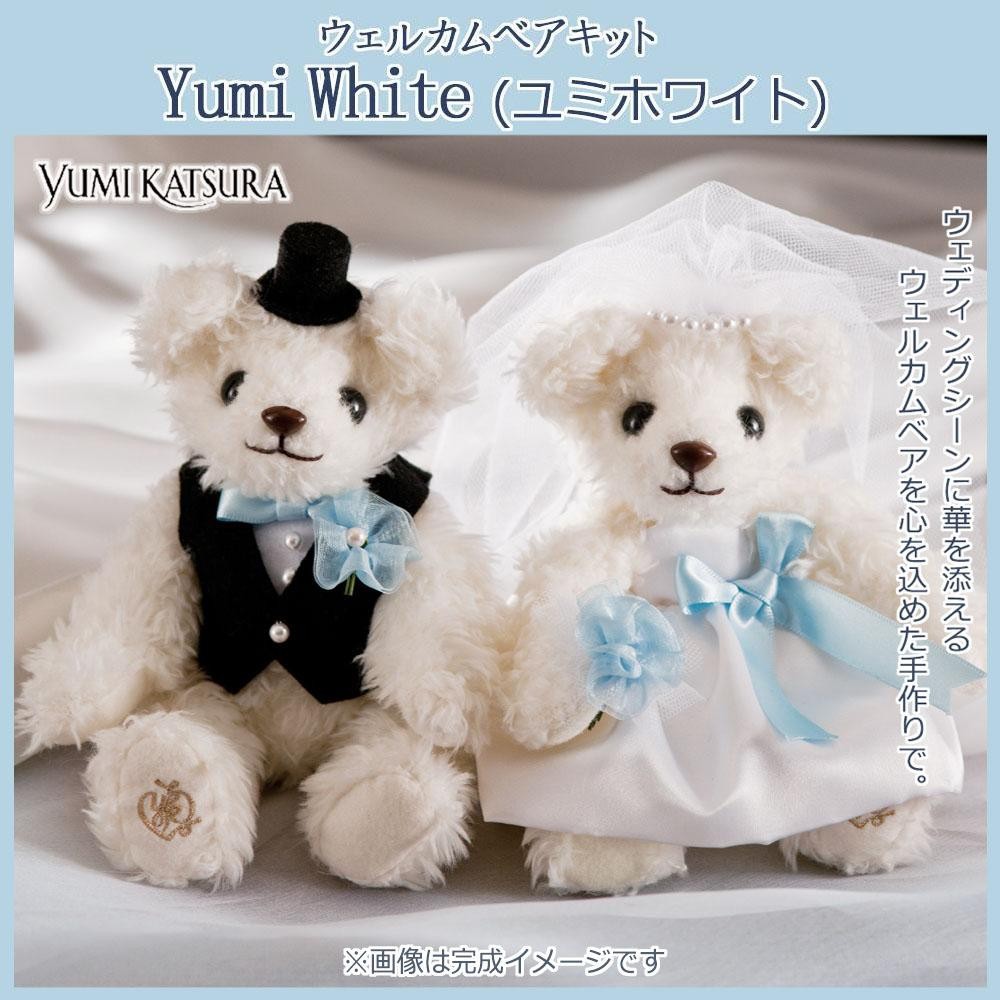 ブライダルファッションデザイナー桂由美のウェルカムベアキット♪ホワイトボア生地を使用したテディベアタイプです。ぬいぐるみ生地はカット済みなので、すぐに縫い始めることができます。花嫁はドレス、花婿はシルクハットとベスト付き。足裏には「YUMI KATSURA」のロゴマークの金糸刺繍が入っています。花嫁が永遠の幸せを掴むためのおまじない「サムシングフォー」の一つ、「サムシングブルー」を取り入れています。 |