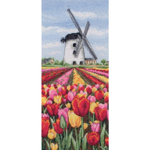 MAIA-Counted Cross Stitch Kit. This kit features a colorful tulip design that will be beautiful as a decoration once it is completed. This package contains a 16 count Aida cloth Anchor stranded cotton and instructions. Design size: 12-1/2x5-1/2 Inch. Design: Dutch Tulips Landscape. Imported.Feature