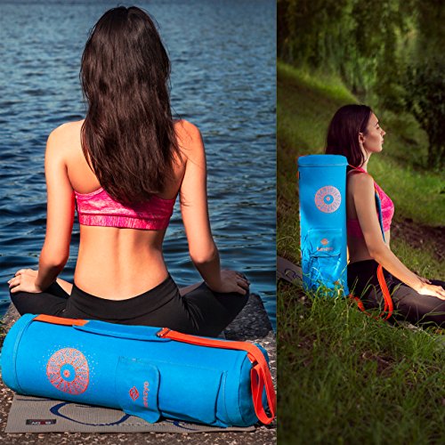 - FULLY ADJUSTABLE STRAP & 4 AIR VENTS: This yoga mat bag comes with an adjustable, soft shoulder strap for customized fit and ease in transport. The strap, with a soft shoulder pad, is very comfortable and puts the mat in a very comfortable position on your shoulder. Adjust it to fit your height and you are good to go. The key feature of this bag is the four eyelets for ventilation, which allows your mat to breathe.