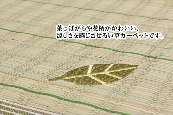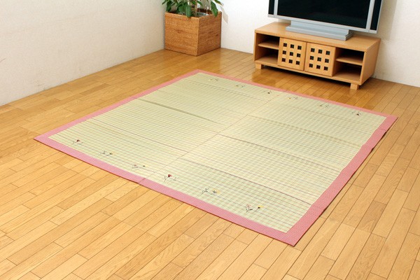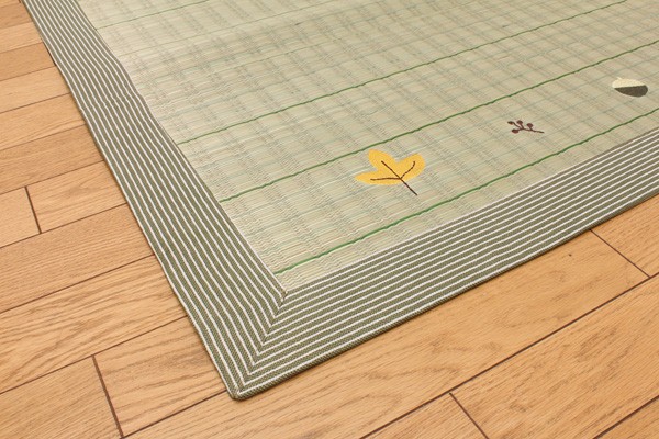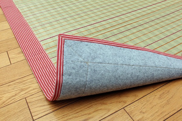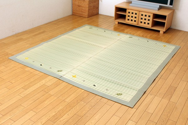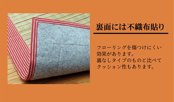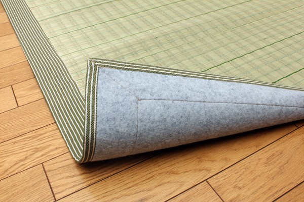 い草には空気の自然浄化作用、湿度の調節作用などがあります。また汚れにくく、使用するうちに黄金色に変化し味が出ます。フローリングを傷つけにくいよう、裏には不織布を貼っています。い草に青森ヒバ加工を施しています。(抗菌、防臭効果)