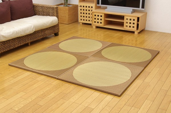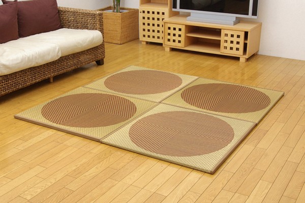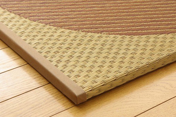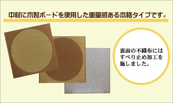 届いたユニット畳を床に置くだけで和のスペースが出来上がります。シンプルな柄にもかかわらず、インパクトのある和モダンな雰囲気に仕上げました。ベージュ色とブラウン色の2色を市松柄に並べても、また違ったイメージをお楽しみ頂けます。国産(九州産)のい草を使用しています。一本一本が太く、表皮が厚く、繊維がキメ細かいので弾力性があり、耐久性に優れています。い草には空気の自然浄化作用、湿度の調節作用などがあります。また汚れにくく、使用するうちに黄金色に変化し、味が出ます。中材に木製ボードを使用した重量感のある本格タイプです。裏の不織布にはすべり止め加工を施しています。また木製ボードとイ草生地の間にフェルト10mmを使用していますので、硬すぎず、やわらかすぎない適度なクッション性があります。