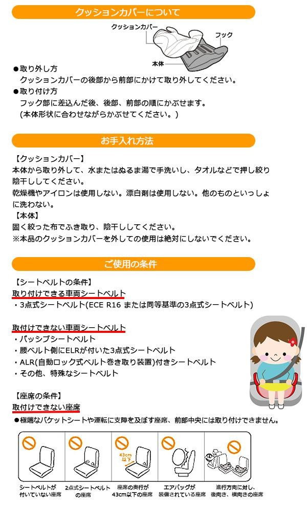 | 仕様 | ECE(欧州安全基準)R44/04安全基準適合品(汎用型グループII~III) 【適応条件】 ・体重:15kg以上~36kg未満 ・身長(目安):100~138cm ・年齢(目安):3歳~10歳頃 ・腰が安定し、1人座りができること。 |