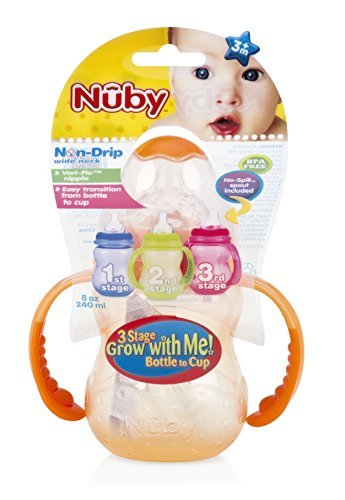 -. Title : Nuby 3-Stage Wide Neck No Spill Bottle with Handles And Non-Drip Juice Spout, 3 Months, 8 Ounce
