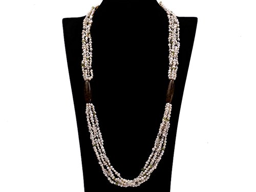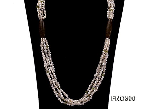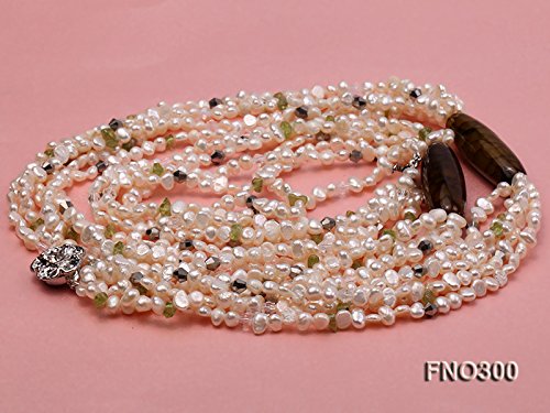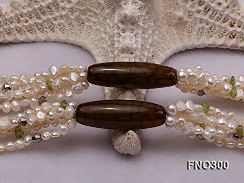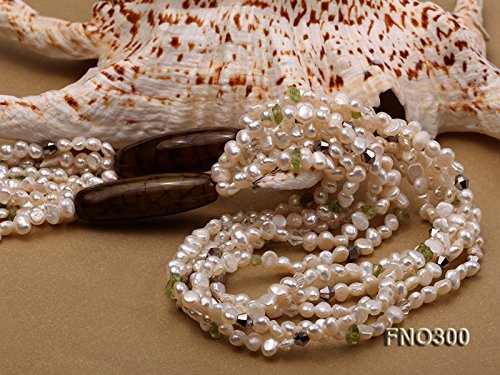 Description *This is a triple strands freshwater cultured pearl necklace made with 4-5mm flat white pearks and olivine chips.