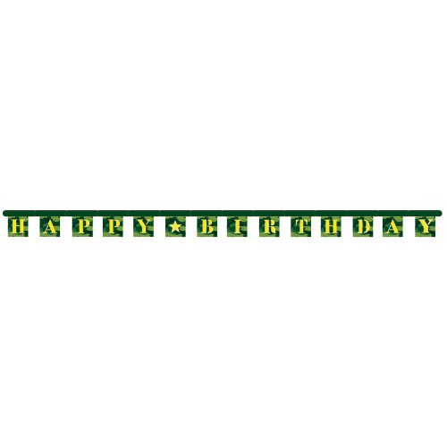 -. Feature : Camo Gear army-themed Happy Birthday jointed party banner / Approximately 7 feet long / Quick and easy way to make any party more festive / Look for coordinating Camo Gear paper plates, napkins, cups, table cover, decorations, invitations, party favors and more / Consistent high quality, color matching and attention to detail in every Creative Converting product