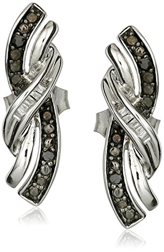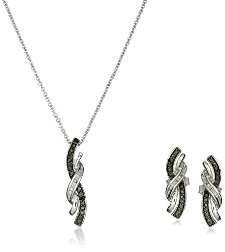 Twists of sterling silver accented by black and white diamond stones create this striking pendant and stud earring set. A wonderful gift idea.