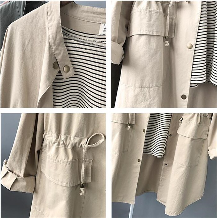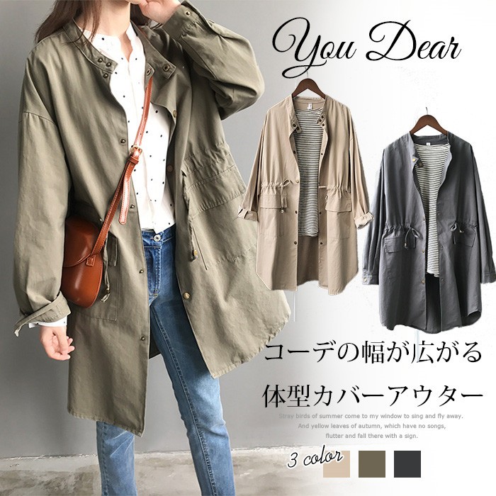 ★素材:ポリエステル ★伸縮性:なし ★厚さ:普通★カラー:ベージュ、緑、グレー(写真参考) ★生産国:中国※お客様ご使用のPC環境により商品画像のカラーが多少異なる場合があります。仕入時期により多少デザインなど異なる場合があります。ご了承ください。★サイズ(CM):M:着丈93 肩幅56 袖丈52 バスト120L:着丈94 肩幅58 袖丈54 バスト124※サイズは人の手によって測っているため、1-3cmの誤差がある場合がございます。予めご了承下さいませ。