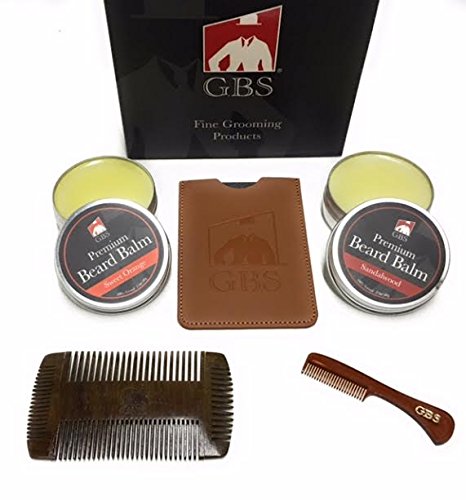 GBS Premium Beard Balm Gift Set- Sweet Orange & Sandalwood Beard Balms with Mustache comb & 4 sided Sandalwood Beard Comb (protective case included)