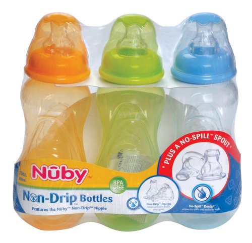 -. Binding : Baby Product -. Brand : Nuby -. Color : Colors May Vary -. Department : baby-boys -. Feature : Includes one no-spill spout / Non -drip bottles features the nuby non-drip nipple / Anti colic air system helps prevent ingestion of air by baby, vari-flow valve allows child to control liquid's flow rate / Colors vary, you will receive one of the following colors - red/blue/green, pink/blue/yellow, blue/green, orange -. Label : Luv N Care/NUBY -. Manufacturer : Luv N Care/NUBY -. Model : Nuby TintedBabyBottle PARENT -. MPN : 1620 -. PartNumber : 1620 -. ProductGroup : Baby Product -. ProductTypeName : BABY_PRODUCT -. Publisher : Luv N Care/NUBY -. ReleaseDate : 2009-10-29 -. Size : 8 - 10 oz -. Studio : Luv N Care/NUBY -. Title : Nuby 3 Pack Tinted Bottle, Colors May Vary
