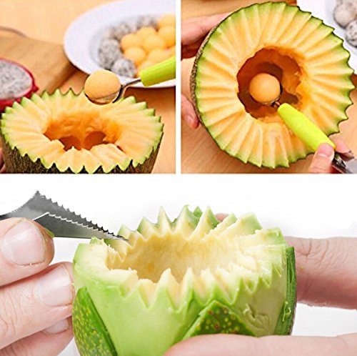 - PERFECT FOR GETTING YOUR 5 A-DAY: Enjoy a refreshing portion of melon in the hot summer days, or simply add to smoothies, fruit salads, or freeze to make popsicles. Also, dual purpose Melon Baller and fruit carving knife can be used for a variety of fruits such as melon, watermelon, or dragon fruit.